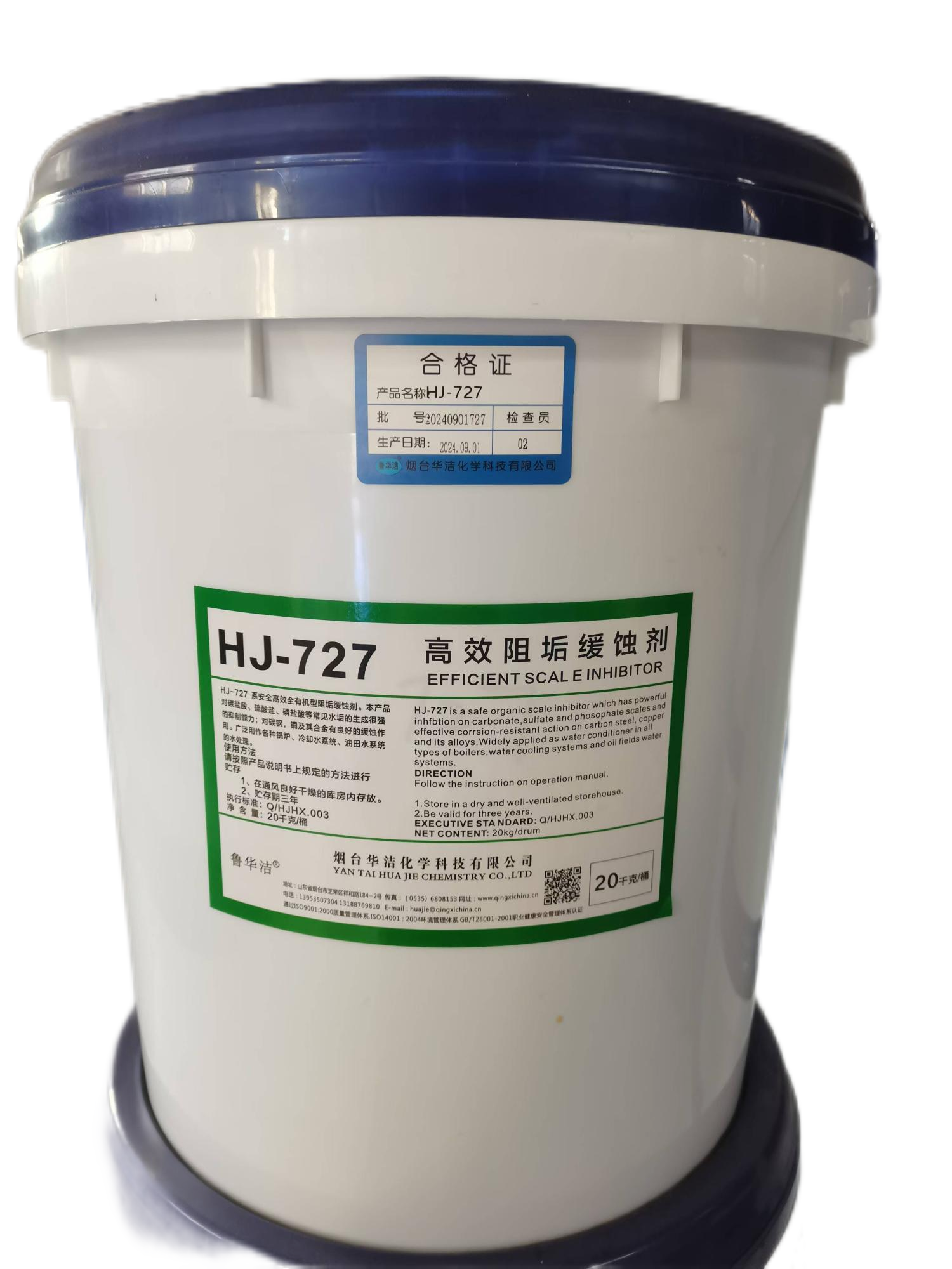 HJ-727系由多种有机膦酸及钼酸盐铜缓蚀剂复配成的一种高效阻垢剂和预膜剂,它对碳酸盐、硫酸盐和磷酸盐等常见水垢有极强的络合和分散能力,对钢铁及铜等材质都有很好的缓蚀预膜效果。